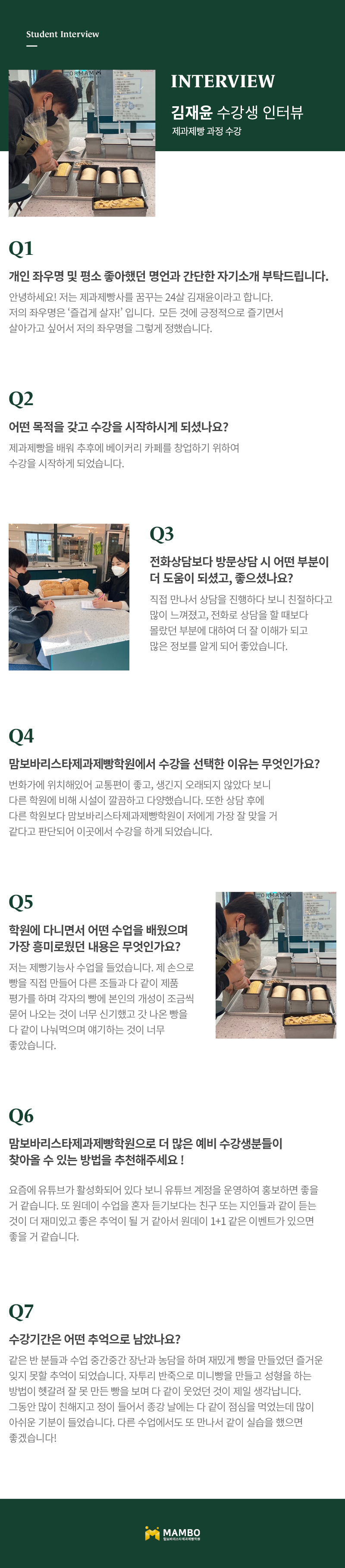제1조 (개인정보 수집에 대한 동의)맘보교육그룹(이하 회사)는 이용자들이 회사의 개인정보취급방침 또는 이용약관의 내용에 대하여 “동의”버튼 또는 “취소”버튼을 클릭할 수 있는 절차를 마련하여, “동의”버튼을 클릭하면 개인정보 수집에 대해 동의한 것으로 봅니다. 제2조 (개인정보 수집항목) 온라인 문의를 통한 상담을 위해 처리하는 개인정보 항목은 아래와 같습니다. 수집항목 : 성명, 이메일, 전화번호 제3조 (개인정보의 이용목적) 회사는 이용자의 사전 동의 없이는 이용자의 개인 정보를 공개하지 않으며, 원활한 고객상담, 각종 서비스의 제공을 위해 아래와 같이 개인정보를 수집하고 있습니다. 모든 정보는 상기 목적에 필요한 용도 이외로는 사용되지 않으며 수집 정보의 범위나 사용 목적, 용도가 변경될 시에는 반드시 사전 동의를 구할 것입니다. - 성명 : 제품상담에 따른 본인 확인 - 이메일, 전화번호 : 제품상담 및 이벤트 관련 고지사항 전달, 새로운 서비스 및 신상품 정보 제공(DM, SMS, 이메일 등 이용) 이용자는 개인정보의 수집/이용에 대한 동의를 거부할 수 있습니다. 다만, 동의를 거부하는 경우 온라인 문의를 통한 상담은 불가하며 서비스 이용 및 혜택 제공에 제한을 받을 수 있습니다. 제4조 (개인정보의 보유 및 이용기간) 원칙적으로 개인정보 수집 및 이용목적이 달성된 후에는 해당 정보를 지체 없이 파기합니다. 그리고 상법, 전자상거래 등에서의 소비자보호에 관한 법률 등 관계법렵의 규정에 의하여 보존할 필요가 있는 경우 회사는 관계법령에서 정한 일정한 기간 동안 정보를 보관합니다. 이 경우 회사는 보관하는 정보를 그 보관의 목적으로만 이용하며 보존기간은 아래와 같습니다. - 계약 또는 청약철회 등에 관한 기록 : 5년(전자상거래등에서의 소비자보호에 관한 법률) - 소비자의 불만 또는 분쟁처리에 관한 기록 : 3년(전자상거래등에서의 소비자 보호에 관한 법률) - 시용정보의 수집/처리 및 이용 등에 관한 기록 : 3년(신용정보의 이용 및 보호에 관한 법률) - 회사는 귀중한 이용자의 개인정보를 안전하게 처리하며, 유출의 방지를 위하여 다음과 같은 방법을 통하여 개인정보를 파기합니다. - 종이에 출력된 개인정보는 분쇄기로 분쇄하거나 소각을 통하여 파기합니다. - 전자적 파일 형태로 저장된 개인정보는 기록을 재생할 수 없는 기술적 방법을 사용하여 삭제합니다.