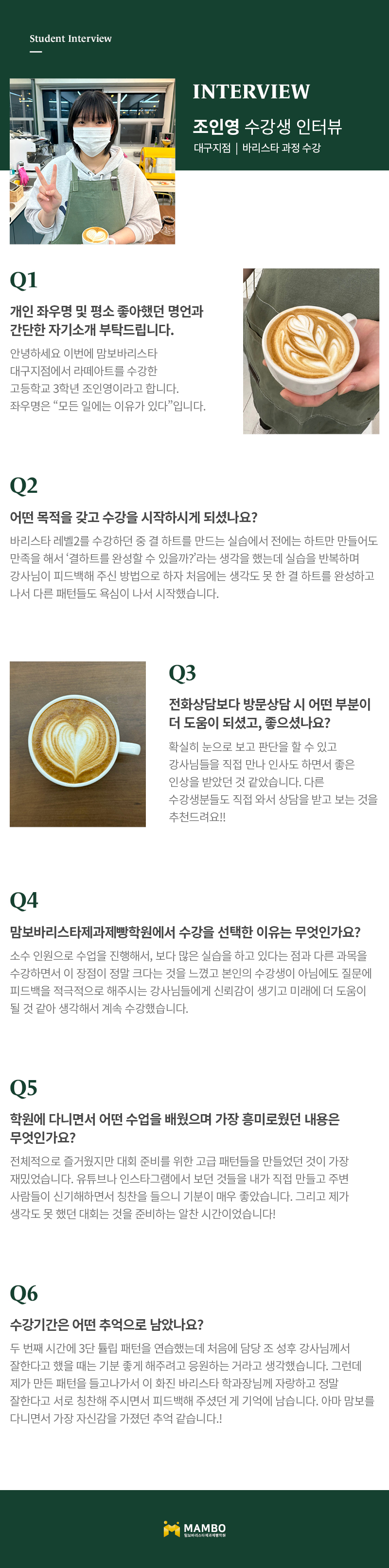 제1조 (개인정보 수집에 대한 동의)맘보교육그룹(이하 회사)는 이용자들이 회사의 개인정보취급방침 또는 이용약관의 내용에 대하여 “동의”버튼 또는 “취소”버튼을 클릭할 수 있는 절차를 마련하여, “동의”버튼을 클릭하면 개인정보 수집에 대해 동의한 것으로 봅니다. 제2조 (개인정보 수집항목) 온라인 문의를 통한 상담을 위해 처리하는 개인정보 항목은 아래와 같습니다. 수집항목 : 성명, 이메일, 전화번호 제3조 (개인정보의 이용목적) 회사는 이용자의 사전 동의 없이는 이용자의 개인 정보를 공개하지 않으며, 원활한 고객상담, 각종 서비스의 제공을 위해 아래와 같이 개인정보를 수집하고 있습니다. 모든 정보는 상기 목적에 필요한 용도 이외로는 사용되지 않으며 수집 정보의 범위나 사용 목적, 용도가 변경될 시에는 반드시 사전 동의를 구할 것입니다. - 성명 : 제품상담에 따른 본인 확인 - 이메일, 전화번호 : 제품상담 및 이벤트 관련 고지사항 전달, 새로운 서비스 및 신상품 정보 제공(DM, SMS, 이메일 등 이용) 이용자는 개인정보의 수집/이용에 대한 동의를 거부할 수 있습니다. 다만, 동의를 거부하는 경우 온라인 문의를 통한 상담은 불가하며 서비스 이용 및 혜택 제공에 제한을 받을 수 있습니다. 제4조 (개인정보의 보유 및 이용기간) 원칙적으로 개인정보 수집 및 이용목적이 달성된 후에는 해당 정보를 지체 없이 파기합니다. 그리고 상법, 전자상거래 등에서의 소비자보호에 관한 법률 등 관계법렵의 규정에 의하여 보존할 필요가 있는 경우 회사는 관계법령에서 정한 일정한 기간 동안 정보를 보관합니다. 이 경우 회사는 보관하는 정보를 그 보관의 목적으로만 이용하며 보존기간은 아래와 같습니다. - 계약 또는 청약철회 등에 관한 기록 : 5년(전자상거래등에서의 소비자보호에 관한 법률) - 소비자의 불만 또는 분쟁처리에 관한 기록 : 3년(전자상거래등에서의 소비자 보호에 관한 법률) - 시용정보의 수집/처리 및 이용 등에 관한 기록 : 3년(신용정보의 이용 및 보호에 관한 법률) - 회사는 귀중한 이용자의 개인정보를 안전하게 처리하며, 유출의 방지를 위하여 다음과 같은 방법을 통하여 개인정보를 파기합니다. - 종이에 출력된 개인정보는 분쇄기로 분쇄하거나 소각을 통하여 파기합니다. - 전자적 파일 형태로 저장된 개인정보는 기록을 재생할 수 없는 기술적 방법을 사용하여 삭제합니다.