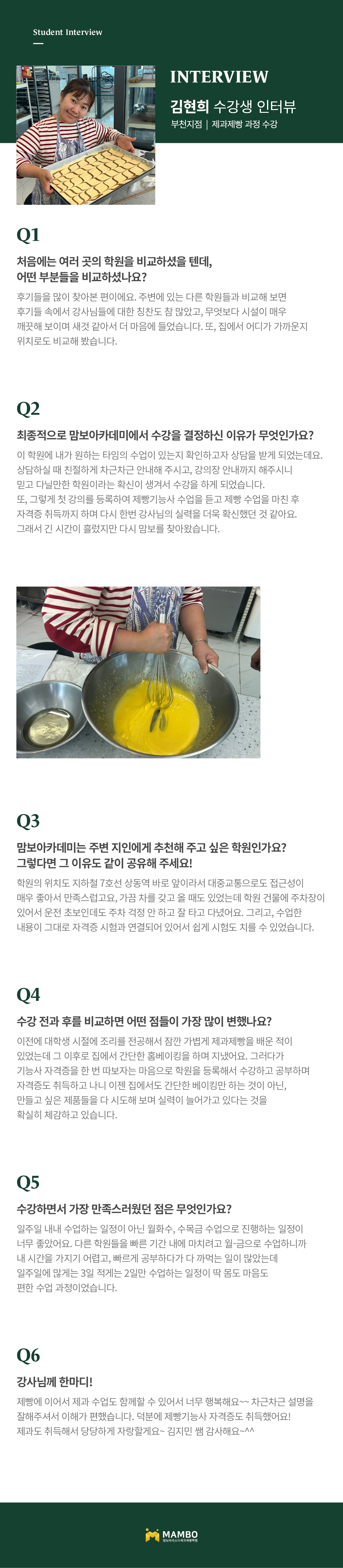 제1조 (개인정보 수집에 대한 동의)맘보교육그룹(이하 회사)는 이용자들이 회사의 개인정보취급방침 또는 이용약관의 내용에 대하여 “동의”버튼 또는 “취소”버튼을 클릭할 수 있는 절차를 마련하여, “동의”버튼을 클릭하면 개인정보 수집에 대해 동의한 것으로 봅니다. 제2조 (개인정보 수집항목) 온라인 문의를 통한 상담을 위해 처리하는 개인정보 항목은 아래와 같습니다. 수집항목 : 성명, 이메일, 전화번호 제3조 (개인정보의 이용목적) 회사는 이용자의 사전 동의 없이는 이용자의 개인 정보를 공개하지 않으며, 원활한 고객상담, 각종 서비스의 제공을 위해 아래와 같이 개인정보를 수집하고 있습니다. 모든 정보는 상기 목적에 필요한 용도 이외로는 사용되지 않으며 수집 정보의 범위나 사용 목적, 용도가 변경될 시에는 반드시 사전 동의를 구할 것입니다. - 성명 : 제품상담에 따른 본인 확인 - 이메일, 전화번호 : 제품상담 및 이벤트 관련 고지사항 전달, 새로운 서비스 및 신상품 정보 제공(DM, SMS, 이메일 등 이용) 이용자는 개인정보의 수집/이용에 대한 동의를 거부할 수 있습니다. 다만, 동의를 거부하는 경우 온라인 문의를 통한 상담은 불가하며 서비스 이용 및 혜택 제공에 제한을 받을 수 있습니다. 제4조 (개인정보의 보유 및 이용기간) 원칙적으로 개인정보 수집 및 이용목적이 달성된 후에는 해당 정보를 지체 없이 파기합니다. 그리고 상법, 전자상거래 등에서의 소비자보호에 관한 법률 등 관계법렵의 규정에 의하여 보존할 필요가 있는 경우 회사는 관계법령에서 정한 일정한 기간 동안 정보를 보관합니다. 이 경우 회사는 보관하는 정보를 그 보관의 목적으로만 이용하며 보존기간은 아래와 같습니다. - 계약 또는 청약철회 등에 관한 기록 : 5년(전자상거래등에서의 소비자보호에 관한 법률) - 소비자의 불만 또는 분쟁처리에 관한 기록 : 3년(전자상거래등에서의 소비자 보호에 관한 법률) - 시용정보의 수집/처리 및 이용 등에 관한 기록 : 3년(신용정보의 이용 및 보호에 관한 법률) - 회사는 귀중한 이용자의 개인정보를 안전하게 처리하며, 유출의 방지를 위하여 다음과 같은 방법을 통하여 개인정보를 파기합니다. - 종이에 출력된 개인정보는 분쇄기로 분쇄하거나 소각을 통하여 파기합니다. - 전자적 파일 형태로 저장된 개인정보는 기록을 재생할 수 없는 기술적 방법을 사용하여 삭제합니다.