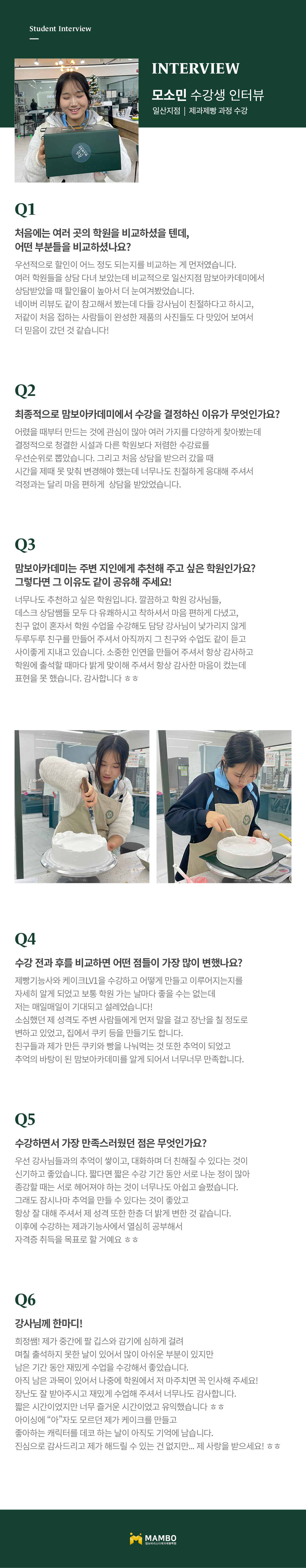 제1조 (개인정보 수집에 대한 동의)맘보교육그룹(이하 회사)는 이용자들이 회사의 개인정보취급방침 또는 이용약관의 내용에 대하여 “동의”버튼 또는 “취소”버튼을 클릭할 수 있는 절차를 마련하여, “동의”버튼을 클릭하면 개인정보 수집에 대해 동의한 것으로 봅니다. 제2조 (개인정보 수집항목) 온라인 문의를 통한 상담을 위해 처리하는 개인정보 항목은 아래와 같습니다. 수집항목 : 성명, 이메일, 전화번호 제3조 (개인정보의 이용목적) 회사는 이용자의 사전 동의 없이는 이용자의 개인 정보를 공개하지 않으며, 원활한 고객상담, 각종 서비스의 제공을 위해 아래와 같이 개인정보를 수집하고 있습니다. 모든 정보는 상기 목적에 필요한 용도 이외로는 사용되지 않으며 수집 정보의 범위나 사용 목적, 용도가 변경될 시에는 반드시 사전 동의를 구할 것입니다. - 성명 : 제품상담에 따른 본인 확인 - 이메일, 전화번호 : 제품상담 및 이벤트 관련 고지사항 전달, 새로운 서비스 및 신상품 정보 제공(DM, SMS, 이메일 등 이용) 이용자는 개인정보의 수집/이용에 대한 동의를 거부할 수 있습니다. 다만, 동의를 거부하는 경우 온라인 문의를 통한 상담은 불가하며 서비스 이용 및 혜택 제공에 제한을 받을 수 있습니다. 제4조 (개인정보의 보유 및 이용기간) 원칙적으로 개인정보 수집 및 이용목적이 달성된 후에는 해당 정보를 지체 없이 파기합니다. 그리고 상법, 전자상거래 등에서의 소비자보호에 관한 법률 등 관계법렵의 규정에 의하여 보존할 필요가 있는 경우 회사는 관계법령에서 정한 일정한 기간 동안 정보를 보관합니다. 이 경우 회사는 보관하는 정보를 그 보관의 목적으로만 이용하며 보존기간은 아래와 같습니다. - 계약 또는 청약철회 등에 관한 기록 : 5년(전자상거래등에서의 소비자보호에 관한 법률) - 소비자의 불만 또는 분쟁처리에 관한 기록 : 3년(전자상거래등에서의 소비자 보호에 관한 법률) - 시용정보의 수집/처리 및 이용 등에 관한 기록 : 3년(신용정보의 이용 및 보호에 관한 법률) - 회사는 귀중한 이용자의 개인정보를 안전하게 처리하며, 유출의 방지를 위하여 다음과 같은 방법을 통하여 개인정보를 파기합니다. - 종이에 출력된 개인정보는 분쇄기로 분쇄하거나 소각을 통하여 파기합니다. - 전자적 파일 형태로 저장된 개인정보는 기록을 재생할 수 없는 기술적 방법을 사용하여 삭제합니다.
