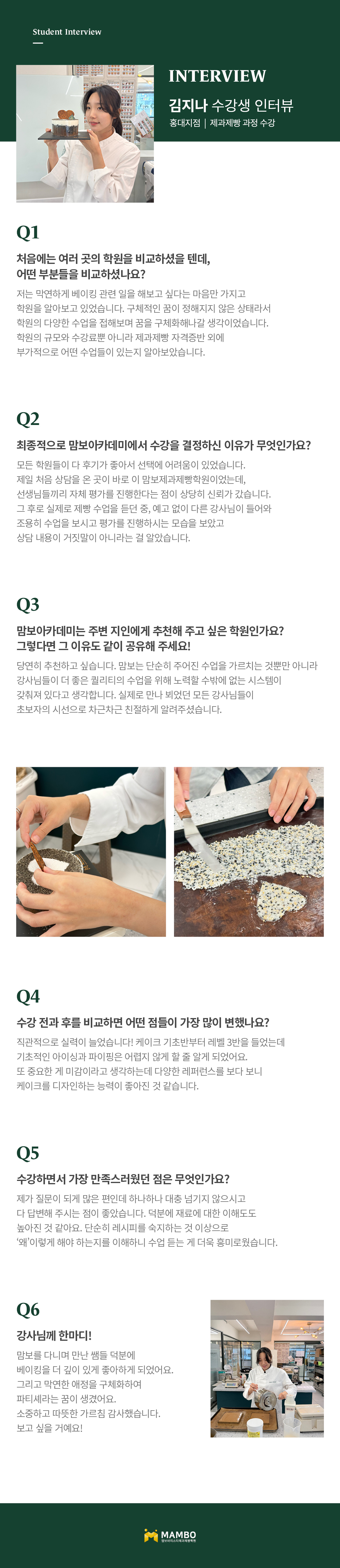제1조 (개인정보 수집에 대한 동의)맘보교육그룹(이하 회사)는 이용자들이 회사의 개인정보취급방침 또는 이용약관의 내용에 대하여 “동의”버튼 또는 “취소”버튼을 클릭할 수 있는 절차를 마련하여, “동의”버튼을 클릭하면 개인정보 수집에 대해 동의한 것으로 봅니다. 제2조 (개인정보 수집항목) 온라인 문의를 통한 상담을 위해 처리하는 개인정보 항목은 아래와 같습니다. 수집항목 : 성명, 이메일, 전화번호 제3조 (개인정보의 이용목적) 회사는 이용자의 사전 동의 없이는 이용자의 개인 정보를 공개하지 않으며, 원활한 고객상담, 각종 서비스의 제공을 위해 아래와 같이 개인정보를 수집하고 있습니다. 모든 정보는 상기 목적에 필요한 용도 이외로는 사용되지 않으며 수집 정보의 범위나 사용 목적, 용도가 변경될 시에는 반드시 사전 동의를 구할 것입니다. - 성명 : 제품상담에 따른 본인 확인 - 이메일, 전화번호 : 제품상담 및 이벤트 관련 고지사항 전달, 새로운 서비스 및 신상품 정보 제공(DM, SMS, 이메일 등 이용) 이용자는 개인정보의 수집/이용에 대한 동의를 거부할 수 있습니다. 다만, 동의를 거부하는 경우 온라인 문의를 통한 상담은 불가하며 서비스 이용 및 혜택 제공에 제한을 받을 수 있습니다. 제4조 (개인정보의 보유 및 이용기간) 원칙적으로 개인정보 수집 및 이용목적이 달성된 후에는 해당 정보를 지체 없이 파기합니다. 그리고 상법, 전자상거래 등에서의 소비자보호에 관한 법률 등 관계법렵의 규정에 의하여 보존할 필요가 있는 경우 회사는 관계법령에서 정한 일정한 기간 동안 정보를 보관합니다. 이 경우 회사는 보관하는 정보를 그 보관의 목적으로만 이용하며 보존기간은 아래와 같습니다. - 계약 또는 청약철회 등에 관한 기록 : 5년(전자상거래등에서의 소비자보호에 관한 법률) - 소비자의 불만 또는 분쟁처리에 관한 기록 : 3년(전자상거래등에서의 소비자 보호에 관한 법률) - 시용정보의 수집/처리 및 이용 등에 관한 기록 : 3년(신용정보의 이용 및 보호에 관한 법률) - 회사는 귀중한 이용자의 개인정보를 안전하게 처리하며, 유출의 방지를 위하여 다음과 같은 방법을 통하여 개인정보를 파기합니다. - 종이에 출력된 개인정보는 분쇄기로 분쇄하거나 소각을 통하여 파기합니다. - 전자적 파일 형태로 저장된 개인정보는 기록을 재생할 수 없는 기술적 방법을 사용하여 삭제합니다.
